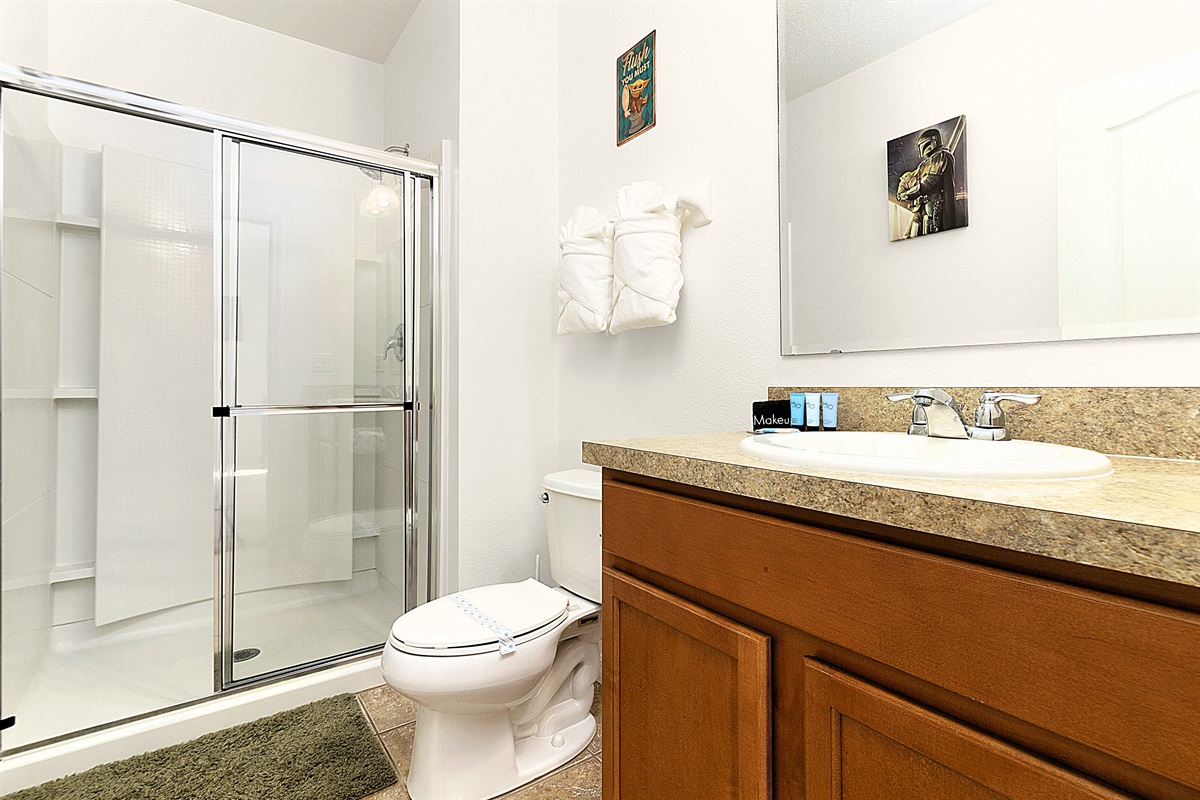 The Mandalori-Inn has two king master suites. The first master suite has a king bed, a 32-inch, flat-screen TV and a walk-in closet. The en suite bathroom has tile floors, a double sink and a full-sized, walk-in shower. The second master suite has a king bed and a 32-inch, flat-screen TV. The en suite bathroom has tile floors, a sink and a full-sized, walk-in shower. The third bedroom has a queen bed with Star Wars bedding and a 32-inch, flat-screen TV. The first twin bedroom is Star Wars themed, has two twin beds and a 32-inch, flat-screen TV. The queen room and the first twin room share a Star Wars themed bath with tile floors and tub/shower combo. This share bath has a door to the lanai just across the hall from it. The second twin bedroom is Star Wars themed and has no TV. The second Star Wars themed, shared bath is just outside this room and has tile floors and a tub/shower combo.