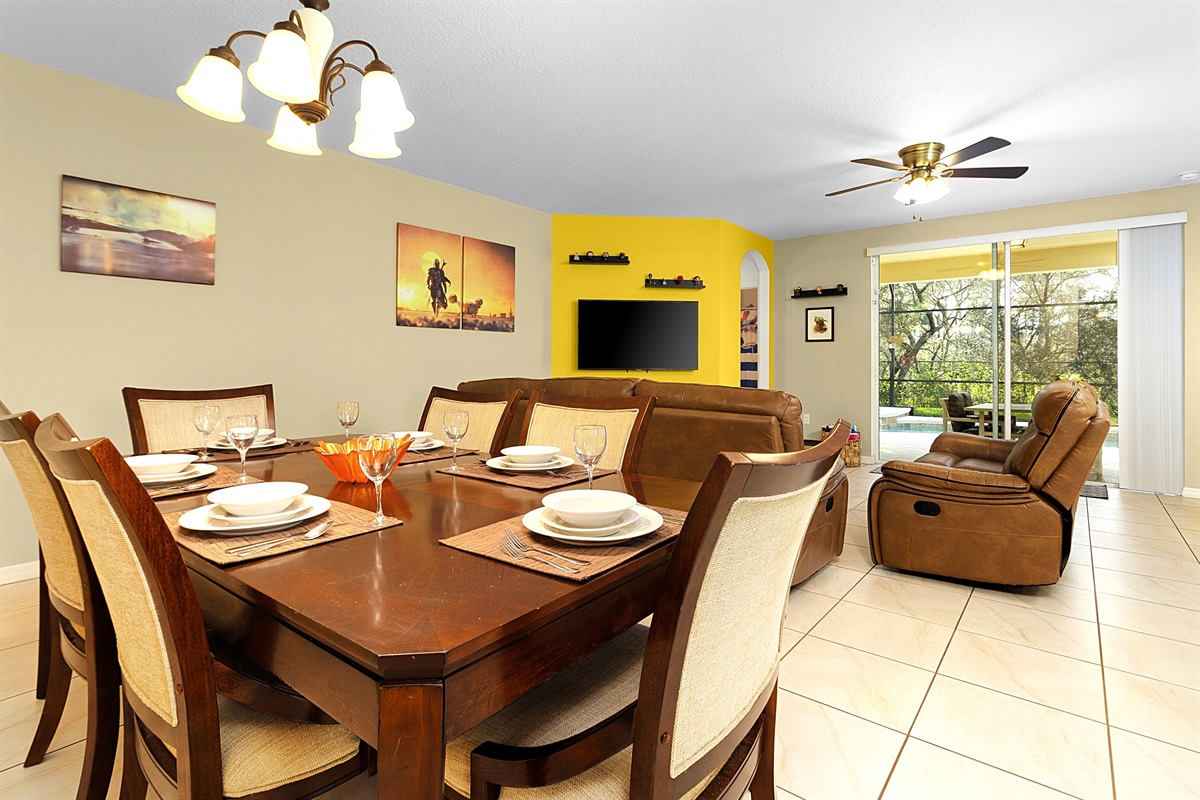 The Mandalori-Inn is bright and spacious. This is our newest villa and it is currently being redecorated with a Star Wars theme. The great room features a leather couch and open floor plan. There are tile floors in all the common areas and new carpet in all the bedrooms. This villa has all the modern conveniences you would expect. There is a 46-inch, wall-mounted, flat-screen TV in the great room, and flat-screen TV's of varying sizes in four of the five bedrooms. There is an XBoxOne gaming system in the great room with two rechargeable, wireless controllers and a wireless printer for your use.
