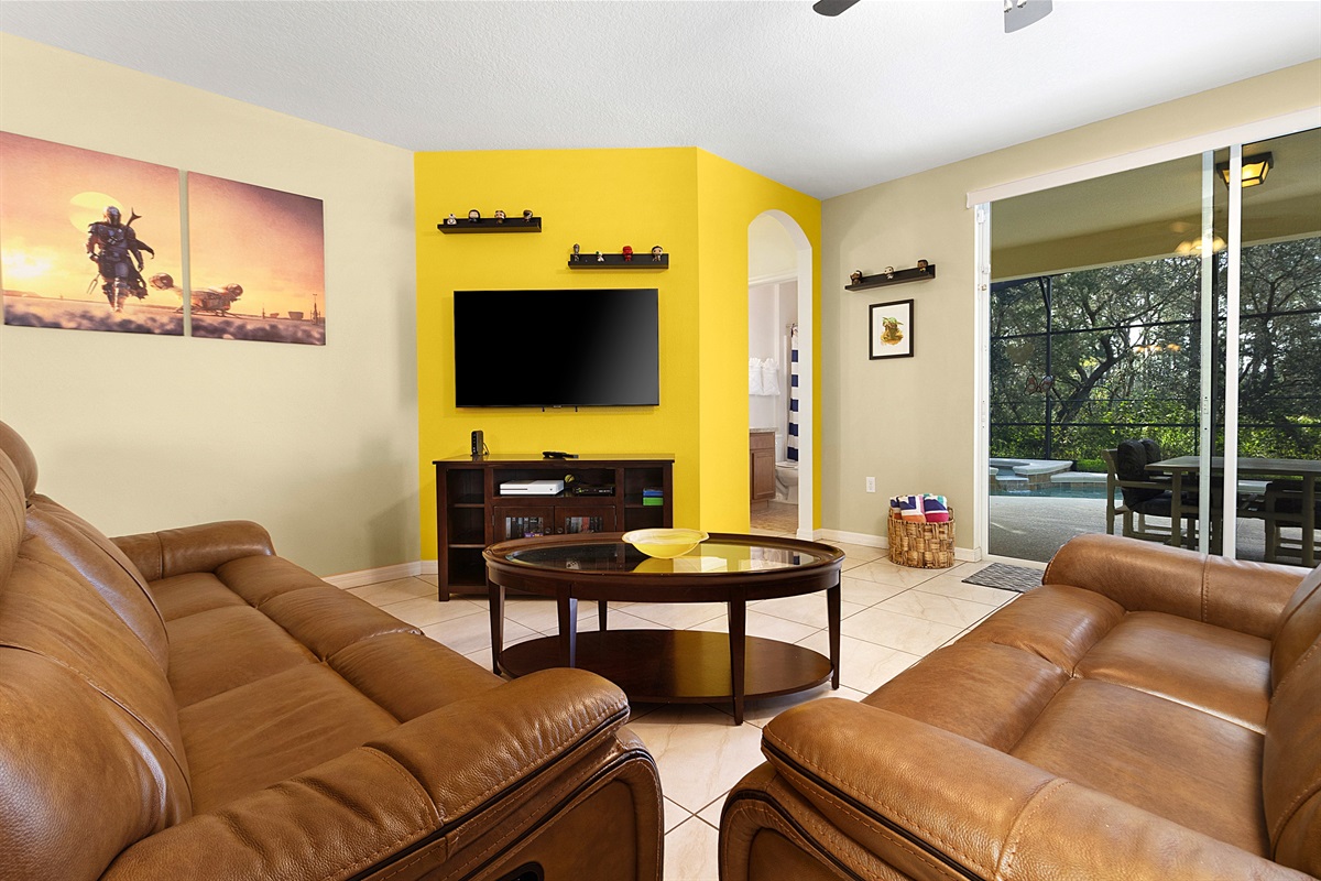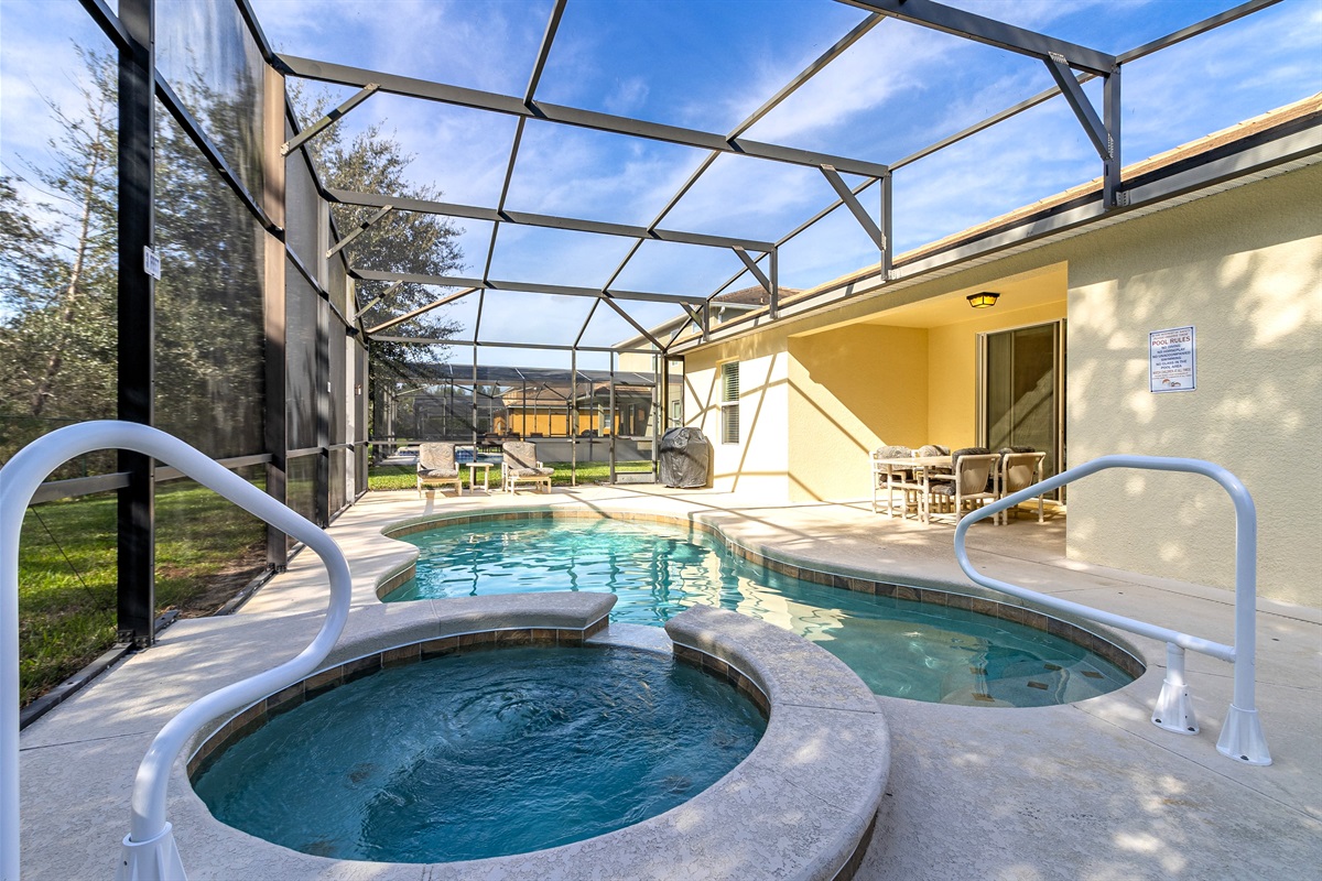 The game room has a pool table, a Foosball table Star Wars décor. The private pool area has a covered lanai with a table and chairs and wall-mounted towel drying rods. The giant, southern facing, swimming pool has an attached spa and looks out to a conservation area. The pool area is surrounded by a screen enclosure.